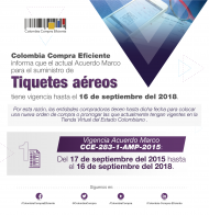 27 de septiembre de 2018CCE informa que el actual Acuerdo Marco para el suministro de tiquetes aéreos tiene vigencia hasta el 16 de septiembre del 2018